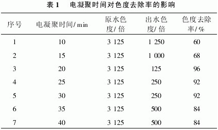 從表1可以看出,隨電凝聚時間的增加,色度的去除率也隨之增加。當電凝聚時間超過20min后,隨時間的增長色度的去除率無明顯變化,其原因與電凝聚-氣浮的原理有關。當電凝聚時間較短時,電極板產生Al3+較少,生成的A(OH)3也就少。因此,電凝聚時間較短時,水樣的色度去除率較低。隨著電凝聚時間的延長,電極板產生Al3+增多,產生Al(OH)3的量也隨之增多,逐漸達到最佳狀態。而當電凝聚時間過長時,色度去除率隨時間延長而出現下降,是因為電解產生過多的Al(OH)3會使膠體表面電荷發生逆轉,破壞了絮凝顆粒的穩定性,循環時間過長,絮體被破壞,絮凝能力下降[3]。考慮到電耗和電極材耗的問題,選擇電凝聚時間為20min作為最佳操作時間值。