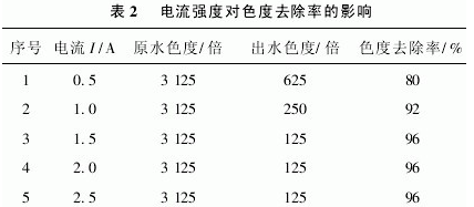 取5份初始色度為3125倍的印染廢水水樣,調節pH=6,電凝聚時間為20min,倒極時間為0.5min,電流強度分別為0.5A、1A、1.5A、2A、2.5A,進行電凝聚-氣浮反應。實驗完畢后,取樣測其色度值,實驗數據見表2。