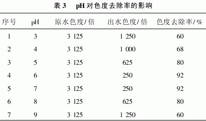 從表3可以看出,進水pH值在3-9范圍內時,處理效果均達到60%以上,隨pH值的增加,色度的去除率先增大后減小,其原因在于以下兩方面:首先pH<4時,溶液中正電荷聚合離子過多,會使膠體電荷改變符號,出現膠體再穩現象,并且不易形成Al(OH)3絮體,起不到凝聚作用;其次pH>10時,溶液中鋁離子主要以Al(OH)-4形式存在[5],對負電荷膠體起不到中和作用,所以去除效果很差。當pH在6左右時,色度去除率較高,可達90%以上。所以選擇pH為6-7作為最佳值。具體參見http://www.dongaorq.cn更多相關技術文檔。
