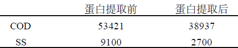 該過程以烯酸鈉為絮凝劑,味精廢水溫度需控制在50 ℃左右,通過氣浮法提取水中蛋白,每80t 廢水可提干蛋白1t 左右,使廢水的污染負荷大大降低。COD可降低30 %~40 % ,SS 降低70 %~80 % ,提取的蛋白營養豐富,可作為飼料,干蛋白市場售價1800~2000元/ t ,經濟效益非常可觀。以某公司的廢水為例,處理效果見表2 :