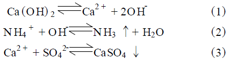 味精廢水經蛋白提取后,對COD 與SS 有所削減,但廢水中的SO4²-濃度變化不大,pH 值為3 左右。高濃度的SO4²-、NH3-N對生化段的厭氧菌和好氧菌將產生抑制作用。據報道,SO4²-的濃度達到5000mg/ L 時,對微生物生長產生抑制作用。當NH3-N濃度高于1500~3000mg/ L 時,pH 高于7. 5 時產生抑制作用。NH3-N濃度高于3000mg/ L 時,無論pH高低,都有抑制作用。因此,必須在中和沉淀段降低SO4²-和NH3-N濃度。Ca (OH) 2 以其價格低,對SO4²-和NH3-N具明顯降低作用等優點而被廣泛采用,其作用機理如下: