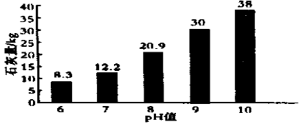 CaSO4 的溶度積Ksp = 1. 96 ×10﹣4。隨著石灰量的增加,使得反應(3) 的平衡向著生成CaSO4 的方向移動。反應(2) 的平衡向著生成NH3 的方向移動。可用吹脫方法去除NH3 。而SO4²-與Ca2 +生成CaSO4 沉淀。石灰用量與pH 值的關系見圖1 。隨著石灰量增加,pH 值逐漸升高,當pH 值達到6 時,廢水僅需石灰8. 3kg/ m3 ,而當pH = 10 時,石灰用量為38kg/ m3 ,為pH = 6 時的近5 倍。