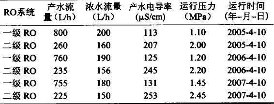 反滲透膜系統(tǒng)處理后的出水主要回用于鍍鎳漂洗水,由于鍍鎳液的工作溫度為55—60"C,在電鍍過程中有大量水分蒸發(fā),故在RO裝置濃液排出的稀鍍鎳液(量少時)可順利加入鍍鎳槽中回用。整個系統(tǒng)從2005年4月運行至今,系統(tǒng)運行平穩(wěn),各項指標均基本達到設(shè)計要求,系統(tǒng)運行參數(shù)見表1。