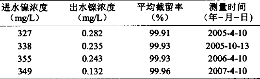 廢水處理監(jiān)測結(jié)果見表2。從實際運行結(jié)果來看,膜法鎳回收系統(tǒng)的鎳回收率達到99.96%,水回用率達到100%,達到設(shè)計要求。本方案對漂洗廢水不但對水資源進行了回收,而且回收了鎳資源。經(jīng)膜系統(tǒng)濃縮5O倍后的濃縮液直接回用到電鍍槽,作為生產(chǎn)工藝的補充用水。本方案處理工藝簡單,維護簡單,無二次污染,較徹底地實現(xiàn)了鍍鎳廢水的零排放。