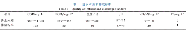 陜西咸陽3530印染廠是從事于軍隊服裝染色的印染企業,在生產過程中有大量的廢水排出。廢水總排放量為3000 ·td-1,環保部門要求其達到《渭河流域(陜西段)工業企業水污染排放標準》二級標準。經過跟蹤調查和水質檢測,確定采用表1所示的進水水質和排放標準[1]。