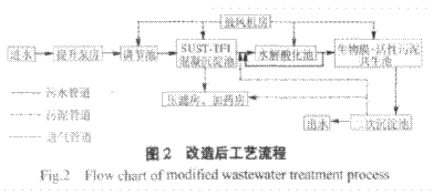 針對印染廢水處理存在的問題,采用鋼鐵酸洗廢液為主要原料制備混凝劑SUST-TF1作為印染廢水的一級強化混凝劑,使COD去除率達到33.1%,色度去除率達到91%,并依靠鐵配合體的強水解配聚能力降低進水pH。回流水解酸化單元出水,利用有機酸的強大緩沖能力中和高堿度進水,節省調節池進水酸調費用;提高水解酸化工段曝氣攪拌強度,實現水解酸化細菌和污水充分混合;以回流二沉池污泥控制溶解氧,為水解酸化細菌提供了最佳生存條件。將生物接觸氧化工藝改造成生物膜-活性污泥共生系統,增加污泥濃度,降低好氧生化段出水COD,最終實現出水達標。