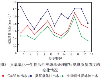 臭氧氧化—生物活性炭濾池處理前后氨氮質量濃度的變化情況見圖 5。由圖 5 可見:CASS池出水的平均氨氮質量濃度為 0.68 mg/L,經臭氧氧化后平均氨氮質量濃度為 1.00 mg/L,不僅沒有下降,反而有所升高,上升約 46.3%。原因可能在于:臭氧能把水中的有機氮和蛋白性氮氧化為氨氮,同時氨氮的化學穩定性較強,不易與臭氧反應,從而引起氨氮質量濃度升高[16]。由圖 5 還可見:臭氧氧化柱出水經生物活性炭濾池降解后平均氨氮質量濃度降至 0.51 mg/L,生物活性炭濾池的平均氨氮去除率為 48.5%;系統平均總氨氮去除率為 24.7%。上述結果表明,氨氮的去除主要依靠生物活性炭的生物氧化作用。