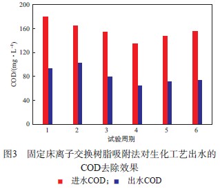 2.2 固定床離子交換樹脂吸附法處理效果固定床離子交換樹脂吸附法對生化工藝出水的COD和色度去除效果分別見圖3和圖4。由圖3可見,6個試驗周期的處理后廢水COD平均為79 mg/L,COD去除率為49.4%。由圖4可見,處理后廢水的色度平均為20倍,色度去除率為96.5%。該方法對色度的去除率較高。固定床離子交換樹脂吸附法需要多個吸附器才能進行連續生產,每個吸附器中的樹脂在達到飽和吸附后需要進行樹脂再生。
