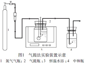 將裝有 15 L 油田廢水的氣提瓶置于一定溫度的恒溫水浴中,通過伸入廢水底部的導管向氣提瓶中通入一定流量的氮氣,使油田廢水中溶解的 H2S擴散到氮氣中隨尾氣排出,尾氣通入裝有飽和氫氧化鈣溶液的中和瓶中,使 H2S 與氫氧化鈣反應。反應一定時間后,取樣測定氣提瓶中油田廢水的 H2S質(zhì)量濃度,計算 H2S 去除率。用鹽酸調(diào)節(jié)油田廢水pH,向油田廢水中加入少量石油,攪拌得到不同含油量的廢水,進行條件實驗。氣提法實驗裝置示意見圖 1。