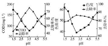 由圖3 可知,pH 對Fe/C 微電解反應有較大的影響。pH太低,鐵屑易鈍化而活性降低,從而影響COD 和色度的去除;COD 在pH 為3.5 時,去除率達到最大為74.5%,廢水中剩余COD 為76.5 mg/L;色度在pH 為3 時,去除率達到最大為86.2%,出水色度為38.6度;色度、COD 的去除率沒有同步在相同pH條件下達到最大,表明廢水中存在一些不產生色度的有機污染物。當pH 繼續增大,色度、COD 的去除率逐漸下降,COD 下降較為明顯。當pH 提高到5.5時,COD 去除率降至48.3%,而色度去除率下降并不顯著,為79.7%。因此在Fe/C 微電解處理染料廢水時最佳pH 應調為3.5 左右。