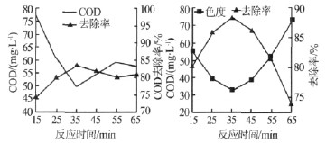 由圖5 可知,反應時間對微電解反應有一定的影響。當反應時間控制在35 min 時,COD 和色度的去除率達到最大值,COD 去除率為83.4%,出水COD 為49.8 mg/L,色度去除率為88.3%,出水色度為32.76度。隨著反應時間的延長,COD 和色度去除率均有下降,色度去除率下降更為明顯,當反應時間為65 min 時,色度去除率降至73.9%,出水色度73.08度,不能達標,可見反應時間延長時,鐵的消耗量增加,溶出大量的Fe2+,并氧化成有色的Fe3+,降低了廢水的脫色效果。