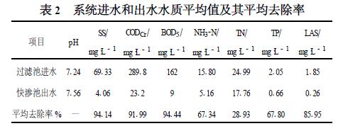 (4) 提高系統的總污染物去除效率。總之,過濾池的引入,可以有效減緩SS 在快滲池中的積累、提高系統的水力負荷、增強系統抗負荷沖擊能力和改善系統出水水質。