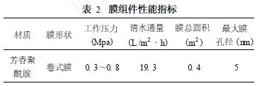 經MBR處理后的出水直接進入納濾膜裝置,通過考察操作壓力、pH值、運行時間和進水流量對納濾膜分離效果的影響,確定本實驗運行的最佳條件。本實驗的納濾膜處理流程采用一級一段循環式處理方式,即將部分濃縮水返回至原水箱與原有的進水混合,然后再通過膜組件分離,這樣既能保證原水在膜表面有足夠的流速,又不至于因回收率太低而造成原水的浪費。實驗選用的膜材料是芳香聚酰胺卷式膜,由杭州凱潔膜技術有限公司提供,膜組件性能指標見表2。