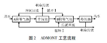 ADMONT 工藝稱為混合回流兩階段活性污泥法,該工藝流程圖如圖2 所示。