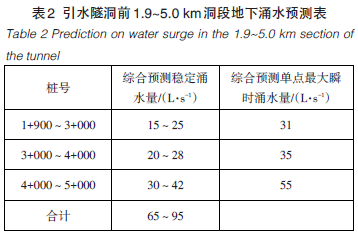 綜合上述方法的分析計算,考慮一定的安全裕度,預測的未開挖洞段穩定涌水量約65~95 L/s,瞬時最大突涌水量為55 L/s,具體分段預測結果見表2。