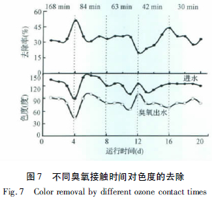 不同臭氧接觸時間對色度的去除效果如圖7 所示。進水色度波動較大,在90~145 度,經25 mg/L且投加比6∶ 3∶ 1 臭氧氧化后出水色度波動也較大,在44~100 度。在不同的臭氧接觸時間內,臭氧對進水色度的平均去除率變化不大,接觸時間從168降到30 min,色度平均去除率分別為36.8%、33.9%、31.7%、33.1% 和33.3%。色度所反映的是大分子或碳碳雙鍵類物質,在較短時間內,臭氧即可將該類物質氧化為有機酸和醛類等小分子物質,因此綜合考慮COD 和色度去除效果,選擇臭氧接觸時間為42 min 較為合理。