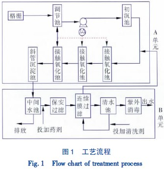 為保證工藝對水質、水量的變化有較強的抗沖擊能力,同時為避免工程運行過程中可能出現的生化階段故障使膜過濾單元受到影響,整體工程設計成A、B兩個單元.A 單元為生化處理單元,主要包括調節池、三級生物接觸氧化、高效沉淀池; B單元為膜過濾單元,主要包括膜過濾裝置以及消毒系統等.與傳統接觸氧化工藝相比,生物處理部分之后增加膜過濾可以在保證出水水質的前提下縮短水力停留時間,減少運行周期,提高運行效率.