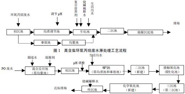 (1) PO 廢水pH 值高,含鹽量高,廢水中CODcr 大部分是易降解的有機物,但還含有氯丙醇、二氯異丙醚、二氯丙烷等難生物降解的有機氯化物。原工藝是物理處理(自然沉淀)和生化處理(生化池)。廢水自然可沉物不高(SS<100mg/L),而CaCl2≥15000mg/L,CODcr 很高,BOD5/CODcr≤0.1,屬不可生物降解或難生物降解的廢水,因此不能單靠生物過程和自然沉淀去除CODcr,是污水 處理的難點。