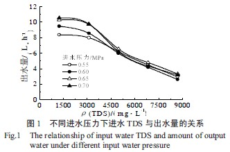 在進(jìn)水壓力分別為0.55、0.60、0.65、0.70 MPa,進(jìn)水TDS 含量分別為1 242.8、3 107.2、4 971.5、6 835.8、8 700.1 mg/L 的條件下,進(jìn)行進(jìn)水壓力、進(jìn)水濃度對(duì)清水出水量影響的試驗(yàn)。不同進(jìn)水壓力下進(jìn)水TDS與出水量的關(guān)系如圖1 所示。