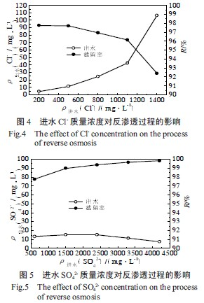 在進(jìn)水壓力為0.60 MPa 的條件下,分別進(jìn)行Cl-和SO42-進(jìn)水質(zhì)量濃度對(duì)反滲透過(guò)程影響的試驗(yàn),試驗(yàn)結(jié)果分別如圖4、圖5 所示。