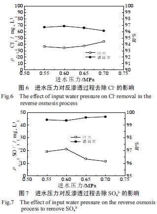 在Cl-、SO42-進(jìn)水質(zhì)量濃度分別為1 100、3 300mg/L 的條件下,進(jìn)行不同進(jìn)水壓力對(duì)于反滲透過(guò)程影響的試驗(yàn),試驗(yàn)結(jié)果如圖6、圖7 所示。