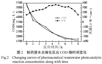 絮凝后的制藥廢水COD 為5 400 mg/L,加入到光催化反應器中調節pH=5,光催化反應8 h。太陽光強為天津市7 月~8 月時間段的陽光光強。光催化處理制藥廢水的結果如表1 和圖1 所示。