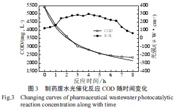 SBR 出水絮凝后的制藥廢水COD 為2 560mg/L,制藥廢水進懸浮型光催化- 膜分離反應器進行光催化反應,光催化反應8 h,調節pH=5。光催化處理結果如表3 所示。