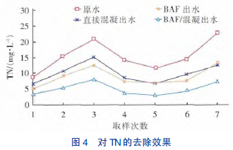 不同工藝對TN 的去除效果如圖4 所示。可以看出,原水的TN 濃度平均為15.54mg/L,經BAF處理后,出水TN 平均為8.86mg/L,去除率為43%左右; 再經后續混凝沉淀處理后,出水TN 濃度在5.02mg/L,平均去除率為67.8%。