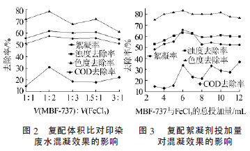 綜上,單獨使用MBF-737 時,絮凝率、濁度去除率、COD 去除率均低,處理效果不佳;而單獨使用FeCl3時,雖色度、濁度的去除率可達70%左右,但需投加較多的絮凝劑,水中殘留的鐵離子濃度大,導致后續(xù)生化處理系統(tǒng)的污泥活性降低,處理效果差。為了提高混凝效果,同時降低無機離子的不良影響,將MBF-737與無機絮凝劑FeCl3復配用于印染廢水處理。