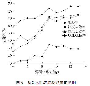 (4)絮凝體系pH 的影響。在廢水處理中,pH 對混凝效果有較大影響。廢水初始pH 對混凝效果的影響見圖6。