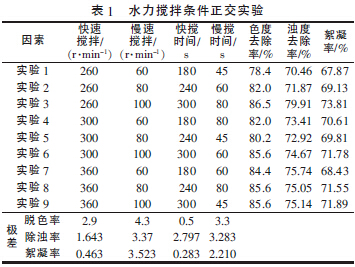 (5)水力攪拌條件對混凝效果的影響。在混凝工藝中,水力攪拌條件是較為顯著的影響因素〔8〕,通過三因素三水平正交實驗考察水力攪拌條件對印染廢水混凝效果的影響,如表1 所示。
