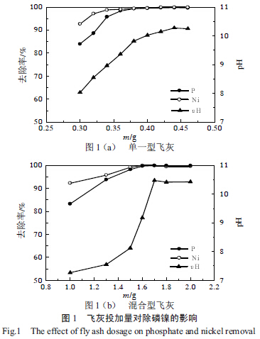 飛灰投加量對除磷鎳的影響見圖1(溫度25℃,初始pH 為5.32,振蕩轉速150 r/min 下60 min)。