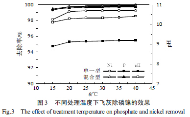 處理溫度對飛灰除磷鎳的影響見圖3(初始pH為5.32,單一型飛灰和混合型飛灰的投加量分別為0.4 g和1.6 g,振蕩轉速150 r/min 下30 min)。