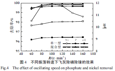 從圖4 可以看出,振蕩速度對2 種飛灰除磷的影響較小。振蕩速度為60~160 r/min 時,2 組實驗中磷的去除率均穩定在99%以上。除鎳的反應也比較類似,在整個振蕩轉速變化范圍內基本都保持在99%左右的去除率。單一型飛灰與混合型飛灰反應后出水pH 均在10.3 與9.0 左右,雖然都在堿性范圍內,但也有所差距,這主要是2 種飛灰本身的酸堿程度不同而引起的。