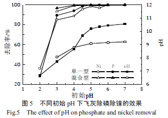 廢水初始pH 對飛灰除磷鎳的影響見圖5(溫度25℃,單一型飛灰和混合型飛灰的投加量分別為0.4 g和1.6 g,振蕩轉速100 r/min 下30 min)。