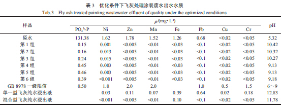 根據飛灰去除涂裝廢水中單因素實驗結果并考慮出水達標,確定以下以優化實驗條件:單一型飛灰,投加量8 g/L,初始pH 不作調整,反應時間30 min,常溫(25 ℃),振蕩轉速100 r/min;混合型飛灰:投加量32 g/L,初始pH 不作調整,反應時間30 min,常溫(25℃),振蕩轉速100 r/min。分別選取對應條件進行多組重復性實驗,結果見表3。其中1~3 組投加飛灰為單一型飛灰,4~6 組投加飛灰為混合型飛灰,采用水平振蕩法取得飛灰純水浸出液。