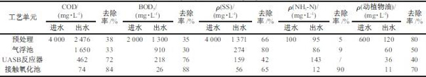 廢水首先經過粗細兩道格柵,粗格柵設在進水口處,以去除廢水中較大漂浮物,細格柵設置在提升泵房后,用以攔截廢水中的碎毛發(fā)和部分懸浮物,格柵出水經提升泵提升進入平流隔油沉淀池,一方面可以除掉漂浮的油脂、油塊,另一方面又可以使大部分不溶于水、密度大于水的雜質沉淀下來。沉淀池出水自流進入曝氣調節(jié)池內,調節(jié)水量,通過曝氣充分混合均勻水質,同時進行預曝氣。廢水隨后進入氣浮池內,通過投加適當的藥劑混凝和加壓溶氣氣浮,使水中的分散油、溶解油及其他部分雜質、SS 得到很好的去除。氣浮池出水進入UASB 厭氧池進行生化處理,通過微生物作用將復雜的有機大分子物質降解為簡單的有機物。廢水經UASB 后自流進入接觸氧化池,有效去除COD 和NH3-N。氣浮池、UASB 厭氧池、接觸氧化池剩余污泥進入儲泥池濃縮后,在污泥脫水車間用帶式濃縮脫水一體機進行壓濾脫水,干污泥定期外運處置,儲泥池上清液和壓濾液回流到廠區(qū)污水系統(tǒng)進行再處理。