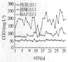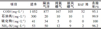 由圖1 可見,當進口石油類為30~582 mg/L(平均103 mg/L)時,氣浮出口的石油類物質平均為32mg/L,氣浮裝置除油能力顯著提高。圖1、圖2 表明,純氧曝氣與鼓風曝氣對石油類和氨氮的去除效果較好。而圖3、圖4 表明,當純氧曝氣進口COD為847mg/L,鼓風曝氣出口處COD僅有89.5 mg/L。顯然兩級生化對氨氮、石油類和COD的去除效果均較好,為BAF 進一步降解COD創造了良好條件。從圖4可以看出,BAF 池出口處的COD平均為51 mg/L,水質優于排放標準。