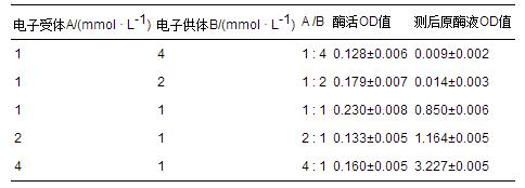 (1)酶反應液電子受體與供體比的選定:選擇電子受供比1 : 4、1 : 2、1 : 1、2 : 1、4 : 1,分別取5組平行樣.