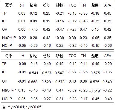 3)相關分析表明,沉積物中磷的含量分布受沉積環境中多方面因素的影響,不同季節相關性大小不同.TP與環境因子相關性不明顯.IP在冬季與粒徑、鹽度呈顯著相關性,隨粒徑增大含量增多,隨鹽度增大含量減少.NaOH-P在夏季隨粒徑增大含量減少,冬季相反,且冬季與鹽度呈顯著負相關關系.HCl-P與粒徑、TOC、TN以及鹽度冬夏季相關性均較差.夏季OP與粘粒、TOC呈顯著正相關關系;冬季,OP與粘粒呈極顯著正相關關系,與粉砂、鹽度、APA呈顯著正相關關系,而與砂粒呈顯著負相關關系.