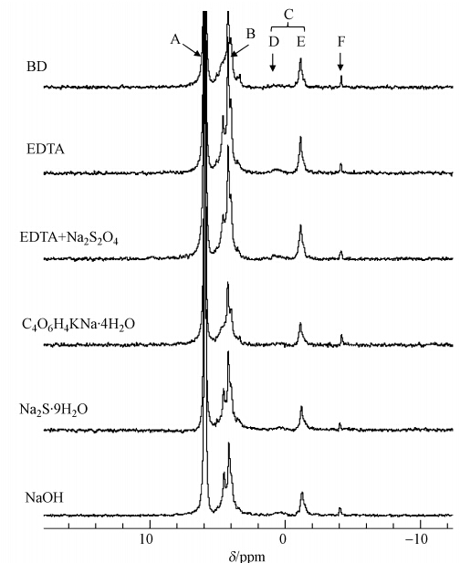 沉積物有機磷提取的最優效果是獲得較理想的有機磷提取量和低濃度的順磁性離子(Fe(Ⅲ)、Mn(Ⅱ)、Co(Ⅱ)、Ni(Ⅱ)),這些順磁性離子的存在會提高弛豫時間,增加譜圖的線寬使峰形重疊(Ding et al., 2010).不同提取劑Fe、Mn等5種離子的提取情況見圖 2.就Fe離子而言,EDTA+Na2S2O4前處理對Fe離子的去除效率最高,提取液中Fe離子濃度為(106677.21±215.82)mg · kg-1.5種前處理中EDTA和EDTA+Na2S2O4前提取液中Mn離子濃度高于其它3個處理,分別為(243.02±2.80)和(266.61±1.84)mg · kg-1.Na2S · 9H2O前提取液中Al離子濃度最高為(217.65±7.12)mg · kg-1.5種提取劑前提取后NaOH溶液提取液中Al離子的濃度EDTA+Na2S2O和EDTA處理較高為(718.95±5.25)和(687.73±3.53)mg · kg-1,其余3個處理NaOH提取液中Al離子濃度均低于前兩個處理.EDTA和EDTA+Na2S2O4兩處理前提取液中Ca離子濃度較高,分別為(22062.99±486.93)和(18729.74±26.93)mg · kg-1.BD、EDTA和EDTA+Na2S2O4前提取液中Mg離子濃度較高,分別為(273.06±1.24)、(238.32±8.37)和(333.68±0.36)mg · kg-1,其余兩處理前提取液中Mg離子濃度較低.