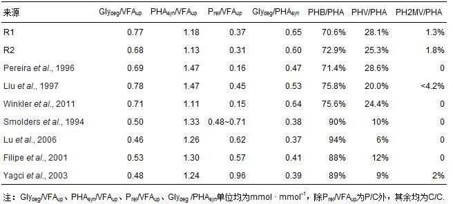 表1 傳統厭氧段與靜置段的化學計量數及PHA組分百分比的比較(以乙酸鈉為碳源)
