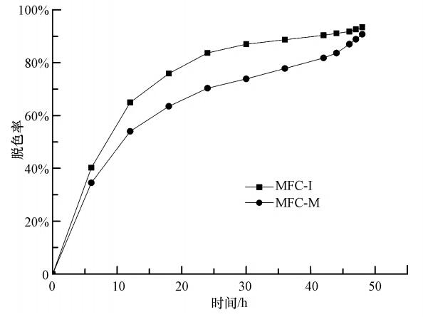 圖 3 穩定運行階段兩種接種源MFC對剛果紅的脫色率-時間曲線
