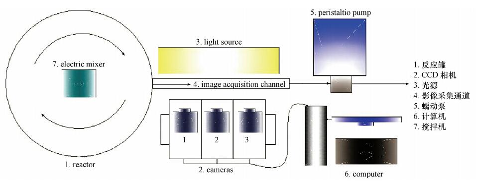 裝置示意圖如圖 1所示,整個反應過程在反應槽內進行,少量反應懸濁液在蠕動泵的工作下以一定流速通過側向打開的圖像采集通道,圖像采集通道尺寸為3 mm×50 mm×200 mm;打開光源控制器,將相機對焦以看清通道內絮體,相機采集流經通道的懸浮顆粒圖像并將圖像保存在計算機上待軟件分析.