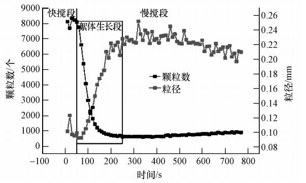 如圖 2所示,反應體系經過快速攪拌段進入慢速攪拌段后,絮體顆粒數目迅速下降,由最初視野范圍內的8000左右降至700左右,顆粒團聚現象明顯;同時絮體顆粒的平均粒徑大小迅速上升,由平均粒徑0.09 mm左右迅速升至0.23 mm左右.從時 間分布上看,絮體生長階段在整個反應過程中所占比例不大,絮體生長速度快.