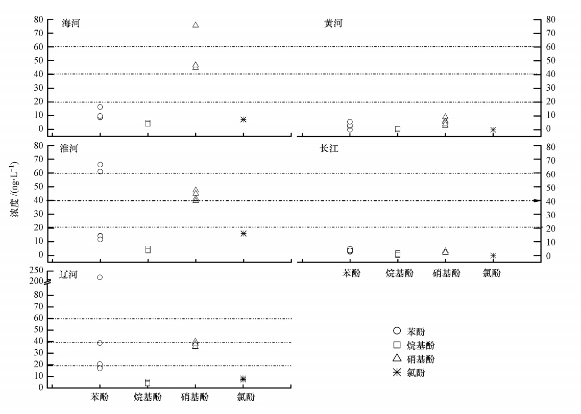 我國目前對酚類物質的研究主要集中在單個河段、湖庫或城市尺度(馮艷紅等,2007;楊建麗等,2009;張兵等,2001;Zhong et al., 2010),對其在全國范圍內的濃度分布特征的研究也只是幾種單個的氯酚化合物,如高繼軍等研究了2,4-二氯苯酚,2,4,6-三氯苯酚和五氯酚在我國地表水中的分布情況(Gao et al., 2008).