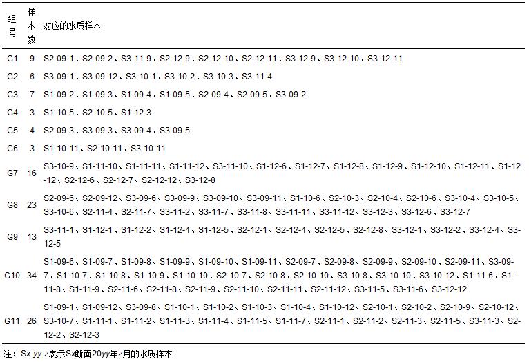采用Ward法對144個樣本進行層次聚類分析.在Ward法中,離差平方和是決定聚類過程的重要指標.通過觀察SPSS18.0生成的聚類表可以看出,離差平方和系數從11類變化到10類時出現了一個大幅度的增加(從296.1增加到320.9);若在坐標系統(類數為橫軸,離差平方和系數為縱軸)中形成曲線可以看出,從11類變化到10類時曲線的斜率出現了一個明顯的增加,在這種情況下應該把144個樣本聚成11組(分別編號G1~G11).表 4顯示了通過層次聚類得到的11個組各自對應的水質樣本點.