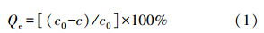 式中,Qe為染料的去除率;c0,c分別為處理前后染料模擬廢水的濃度(mg · L-1).