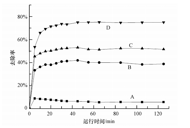 圖 4 傳統CWPO與iCWPO處理效果的對比(A工況:不投加H2O2,恒溫30 ℃;B工況:投加H2O2,恒溫30 ℃;C工況:投加H2O2,傳統供熱60 ℃;D工況:投加H2O2,感應供熱60℃)