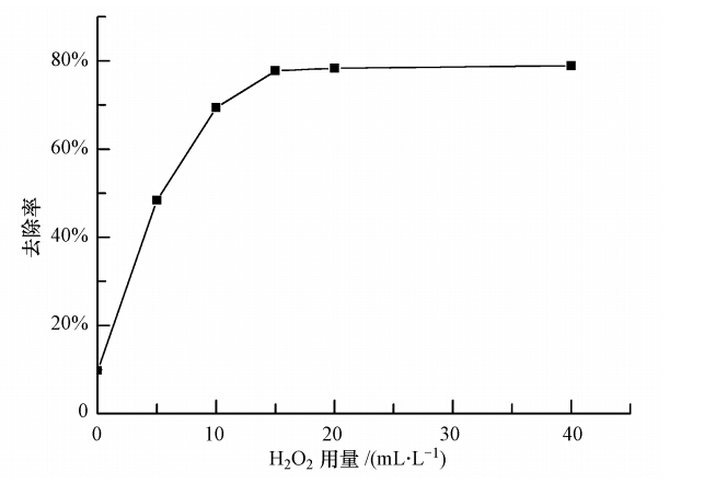 圖 8顯示進水中H2O2投加量對mNiO/C催化降解染料廢水影響顯著.當H2O2的投加量為0時,即單催化劑的效果微乎其微.隨著H2O2投加量的增加,染料的去除率不斷上升,說明H2O2的加入,并非僅僅是直接氧化,而是利用其在催化劑表面產生· OH而實現間接強氧化.當進水中H2O2投加量增加至15 mL · L-1時,染料的去除率達到78.79%,繼續增加H2O2投加量,出水效果變化不明顯.實驗表明過量的H2O2并不能提高對染料的去除率,這是因為過量的H2O2能與· OH發生以下反應: